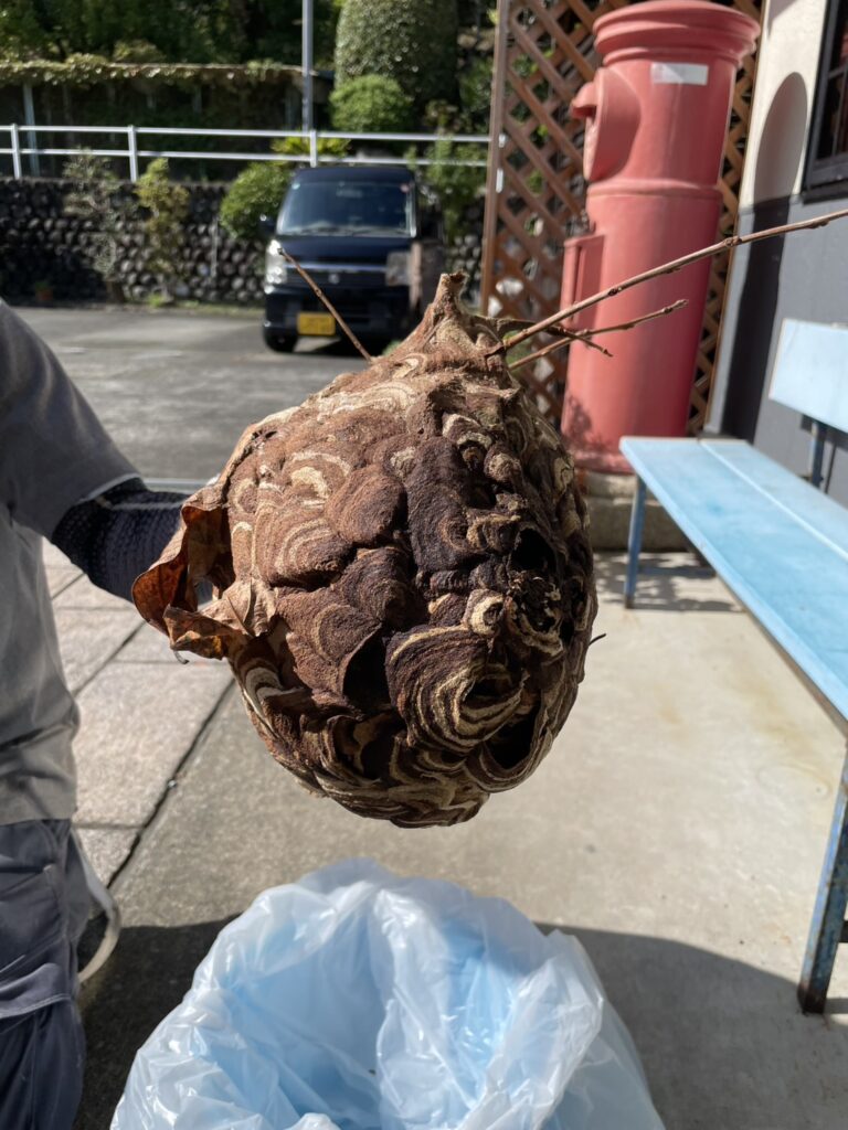 スズメバチの巣が柿の木に出来ました。下から見てる時より随分大きかったです。